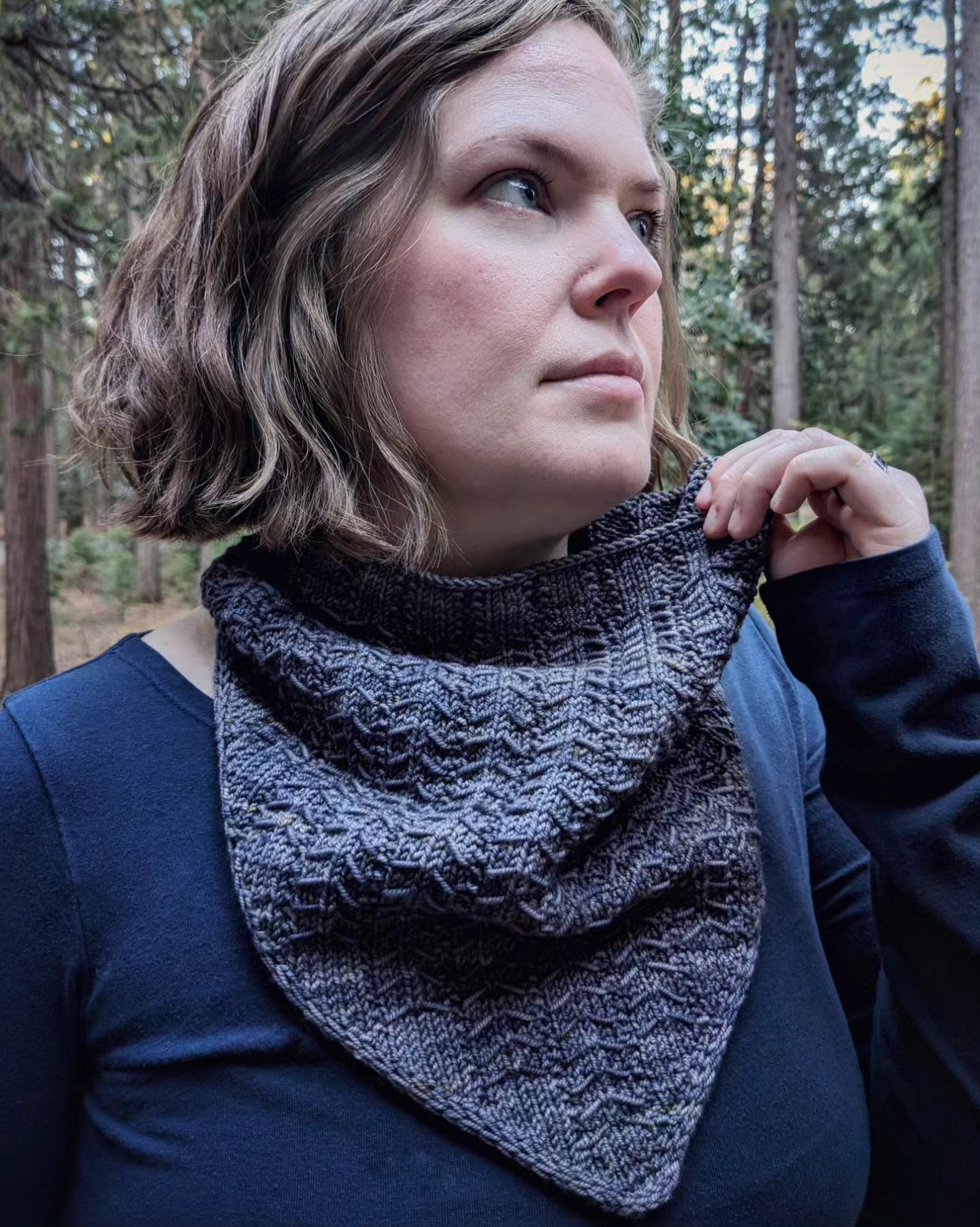 Inspired by the iconic bridges of Portland, Oregon, this cowl features textured stitches reminiscent of the architecture and trusses of the St. Johns bridge. This bandana cowl features i-cord edging, smocking stitch, and a unique ribbed edge that show off tonal, speckled, and variegated colorways alike. Worked from CO point with an i-cord tab, increasing in size before joining triangle in the round for the neckline, this cowl is relaxing to knit with an easy-to-memorize textured smocking stitch against the tonal background.