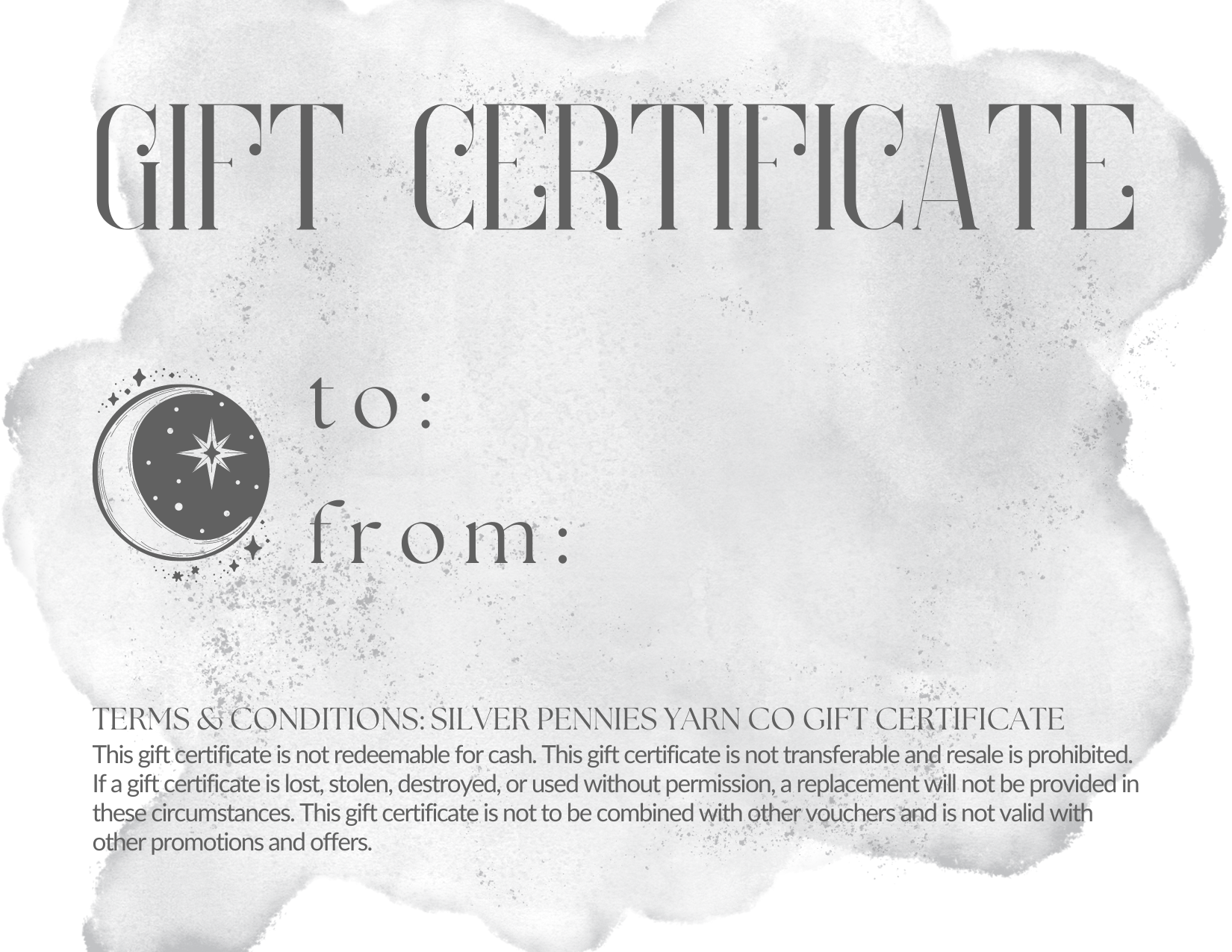 Give the gift of yarn with an digital gift card for Silver Pennies Yarn Co. Immediate purchase and easy to redeem.